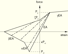 In compression the buckling strut response models, in a simple way, the highly nonlinear buckling and postbuckling damage of slender members when loaded monotonically or cyclically. In tension the response is modeled by isotropic hardening plasticity. The buckling strut envelope is phenomenological, derived from experiments with pipe-like members. Since the description of the buckling envelope includes the outer pipe diameter and the pipe thickness, only pipe cross-section types are permitted with buckling strut response.
