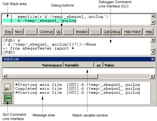 The debugger consists of a call stack area, action buttons, and the debugger command line interface (CLI) window, as shown in Figure 7–4. The debugger is positioned between the Abaqus PDE main window and the message area.