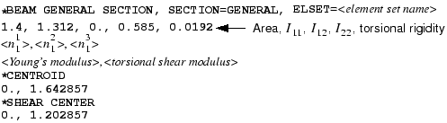 *BEAM GENERAL SECTION, ELSET=<element set name>, SECTION=<section type> <cross-section dimensions> or <section engineering properties> <>,<